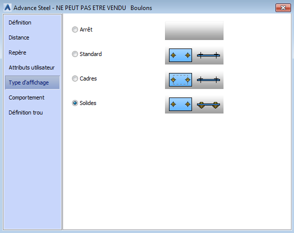 Dans cet onglet de la boîte de dialogue Propriétés, vous pouvez sélectionner la manière dont les boulons s'affichent dans le modèle.