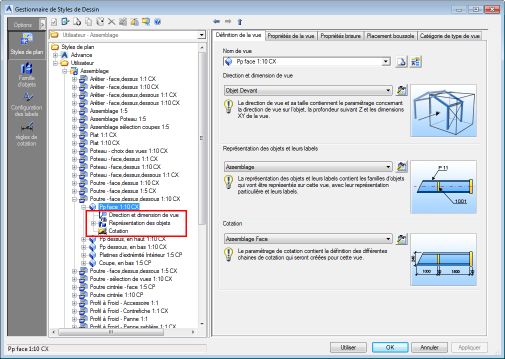 Les aspects de chaque vue sont contenus dans le panneau d'arborescence du Gestionnaire de styles de dessin et dans l'onglet Définition de la vue. La sélection d'un élément dans l'arborescence affiche les propriétés de l'élément dans le panneau des propriétés.