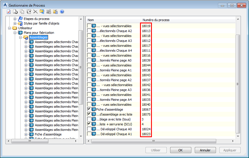 Vous pouvez également appeler des plans manuellement à l'aide de la commande _AstM4CommDetailingProc User et du numéro du plan. La colonne de numéro du plan affiche le numéro associé à chaque plan.