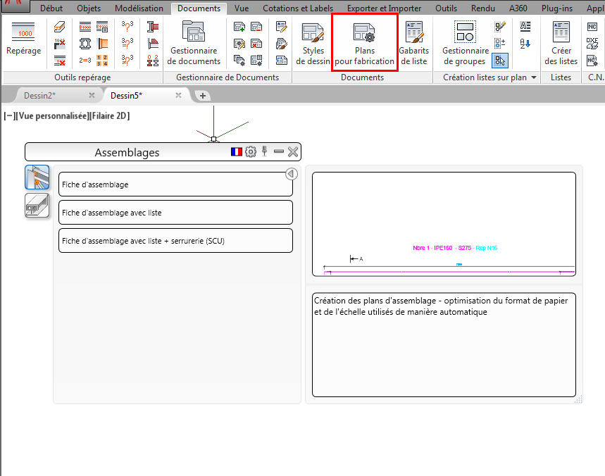 Vous pouvez également accéder aux plans de fabrication à l'aide de la palette Plans pour fabrication dans l'onglet Documents