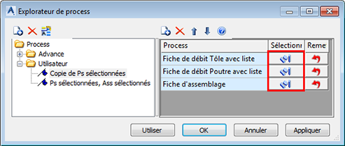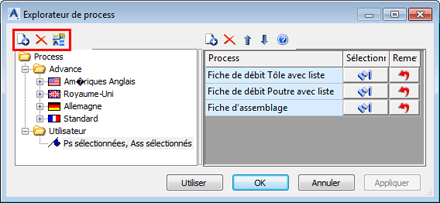 A l'aide des boutons situés dans le coin supérieur gauche de la boîte de dialogue Explorateur de process, vous pouvez renommer la suite (plan) existant, copier une suite de plan ou en créer une.