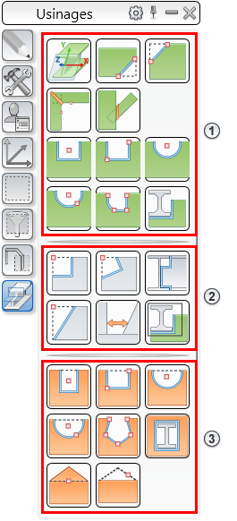 Pour découper ou gruger les contours, utilisez les outils de la palette Usinages :