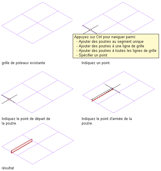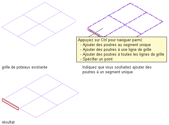 | ajouter une poutre le long d'un ou plusieurs segments d'une grille de poteaux (lorsque le type de positionnement correspond à Bord) | déplacez le pointeur sur un segment de la grille afin d'afficher un aperçu de la poutre, puis cliquez pour ajouter une poutre le long de ce segment ou appuyez sur la touche Ctrl et cliquez pour ajouter des poutres le long de tous les segments de cette ligne de grille ou appuyez sur la touche Ctrl à deux reprises pour ajouter des poutres le long de tous les segments de la grille. Appuyez sur Entrée pour mettre fin à la commande. |
