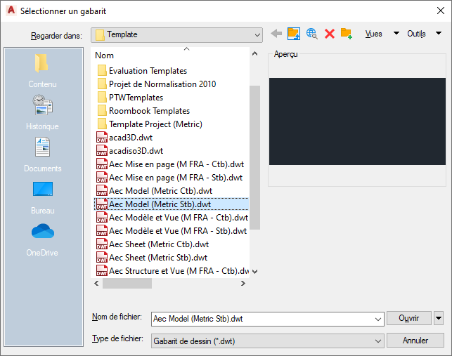 Les gabarits de dessin fournis avec le programme se trouvent sous C:\ProgramData\Autodesk\ACA <version>\fra\Template. Les fichiers de gabarit portent l'extension DWT.