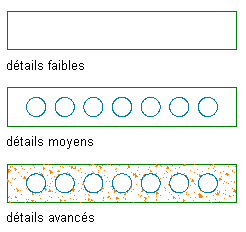 Lorsque vous créez une forme personnalisée, vous pouvez définir trois géométries distinctes (détails faibles, moyens ou avancés) adaptées aux différents niveaux de détail des représentations d'affichage (par exemple, Plan non détaillé, Plan et Plan détaillé). Les géométries de la nouvelle forme peuvent être définies intégralement par le dessin au trait dans la zone de dessin. Vous pouvez également utiliser une définition de forme personnalisée existante comme gabarit et la modifier afin de redéfinir l'une de ses géométries.