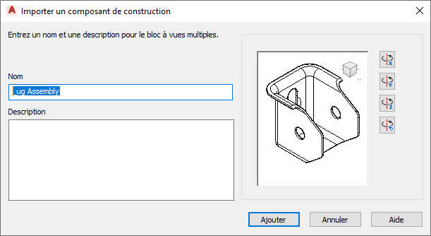 Cela provoque l'ouverture de la boîte de dialogue d'importation dans laquelle vous pouvez spécifier un nom, une description et changer l'orientation du bloc ou du bloc à vues multiples au moment de l'insertion.