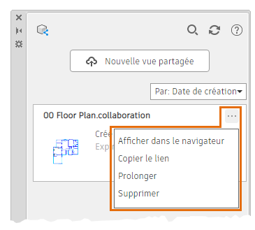 Démarre le processus de création d'une vue partagée. Affiche la boîte de dialogue Partager la vue avec plusieurs options. Ensuite, les données sont extraites du dessin afin de créer une vue qui sera provisoirement publiée à un emplacement de votre compte Autodesk Account Web et mobile, et un lien (que vous pouvez partager) vers cet emplacement est généré.
