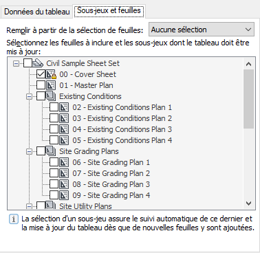 Onglet Sous-jeux et feuilles (boîte de dialogue Tableau des feuilles)