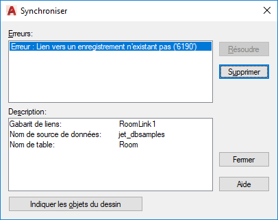 La boîte de dialogue Synchroniser affiche la liste des erreurs détectées. Certaines erreurs (comme par exemple, une colonne redimensionnée dans la table de la base de données source) peuvent être corrigées directement dans la boîte de dialogue Synchroniser. D'autres (telles que des liens renvoyant à des enregistrements inexistants) doivent être rectifiées dans la table de base de données source.