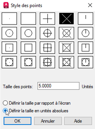 Vous pouvez choisir si la taille de l’objet point est déterminée par la taille de l’écran d’affichage, c’est-à-dire que la taille du point dépend du zoom avant appliqué lorsque vous créez le point, ou si elle est définie sur une taille absolue.