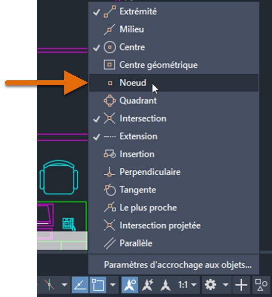 Maintenant que les points sont créés, nous allons également nous assurer que le mode d’accrochage aux objets nœuds est activé, afin de pouvoir acquérir ces points.