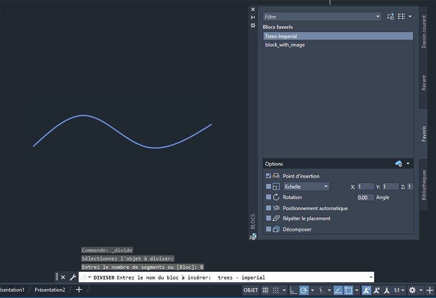 Jusqu’à présent, nous avons utilisé les commandes DIVISER et MESURER pour placer des points sur des objets, mais vous pouvez également utiliser l’option Bloc pour placer des blocs sur la longueur ou le périmètre d’un objet. Dans l’exemple suivant, nous allons utiliser DIVISER pour placer cinq blocs espacés régulièrement (dans ce cas, des arbres) le long d’une spline.