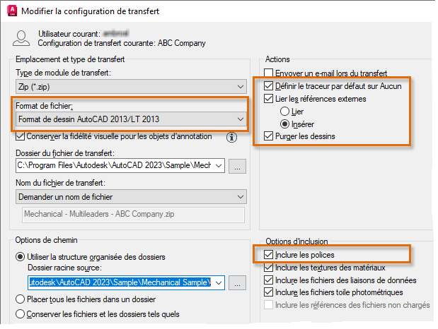 La configuration de transfert définit les paramètres utilisés pour définir le module de transfert, ainsi que la façon dont le dessin et les fichiers associés doivent être mis à jour.