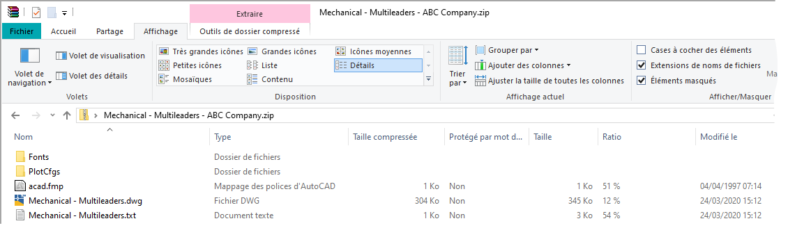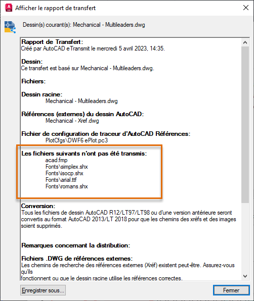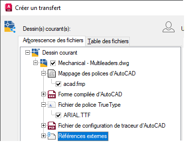 Notez le changement dans l'arborescence des fichiers : les fichiers associés aux polices utilisées dans le dessin font désormais partie du module de transfert.