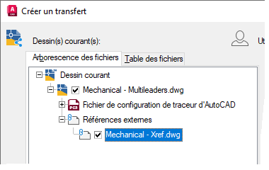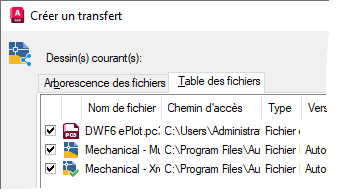 Lorsque vous utilisez eTransmit, la fonctionnalité analyse le dessin courant à le recherche de fichiers référencés, et ceux-ci s'affichent dans la boîte de dialogue Créer un transfert.