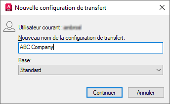 Dans le champ Nouveau nom de la configuration de transfert de la boîte de dialogue Nouvelle configuration de transfert, remplacez le nom par défaut par "Entreprise ABC". Cliquez sur Continuer.