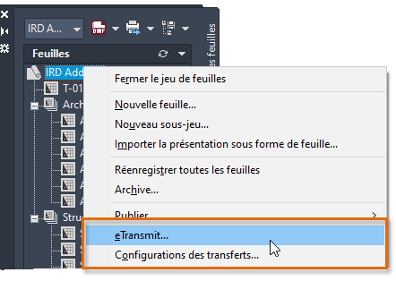 Remarque : Le gestionnaire du jeu de feuilles contient une option d'archivage semblable à la fonctionnalité eTransmit, mais qui offre moins d'options concernant le nettoyage des dessins, car elle a été conçue dans le but de sauvegarder tous les fichiers.