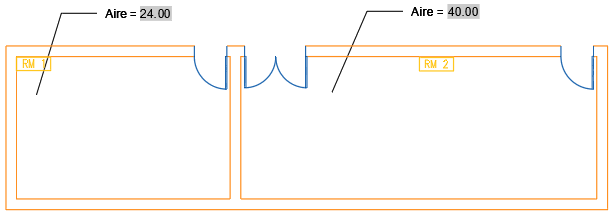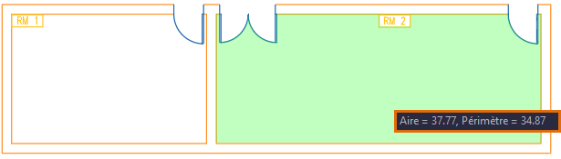 Le périmètre de RM 2 est tracé avec une polyligne ouverte. Lorsque vous êtes invité à sélectionner l’objet dans la boîte de dialogue Champ, cliquez sur la polyligne qui correspond au bas et aux côtés de la pièce. La ligne supérieure n’est pas une polyligne fermée pour la pièce. Il est recommandé de vérifier l’aperçu de la valeur calculée dans la boîte de dialogue Champ.