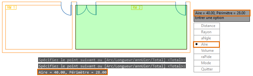L’aire calculée s’affiche dans la fenêtre de commande et dans une info-bulle dynamique. Si les résultats ne sont pas visibles, appuyez sur F2 pour ouvrir la fenêtre de commande.