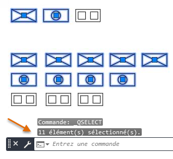 Les blocs spécifiés sont maintenant sélectionnés et inclus dans un nouveau jeu de sélection, et le décompte exact des blocs spécifiés est indiqué dans la fenêtre de commande.