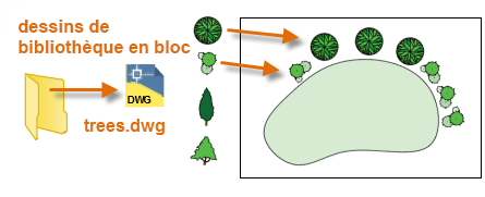 Trois éléments sont impliqués pour l'insertion de blocs dans un dessin.