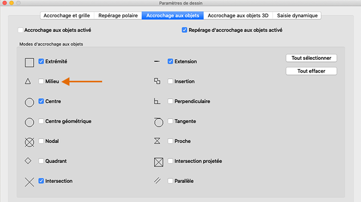 Pour activer ou désactiver le repérage par accrochage aux objets, appuyez sur la touche F11 ou sur
