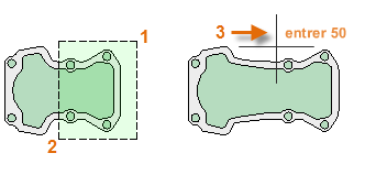 ou tapez E dans la fenêtre de commande) et sélectionnez les objets à l'aide d'une sélection par capture, comme illustré ci-dessous (1 et 2). La sélection par capture est obligatoire ; seule la géométrie traversée par la sélection par capture est étirée. Cliquez ensuite n'importe où dans la zone de dessin (3), déplacez le curseur vers la droite, puis entrez 50 pour la distance. Cette distance peut représenter des millimètres ou des pieds.