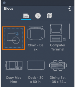 Pour rechercher un bloc sur la palette, entrez une chaîne de texte dans le champ de recherche. Seuls les blocs dont les noms contiennent la chaîne de texte sont affichés dans la liste des blocs. Les résultats de la recherche incluent des blocs issus du dessin courant, de la liste des blocs utilisés récemment, des favoris et de la bibliothèque de blocs.