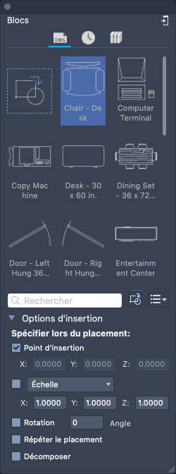 Avant d'insérer un bloc à partir d'une vue, définissez les options d'insertion telles que Point d'insertion, Échelle, Rotation, Répéter le placement et plus encore. Si l'option Répéter le placement est activée, appuyez sur la touche Échap pour quitter la commande.