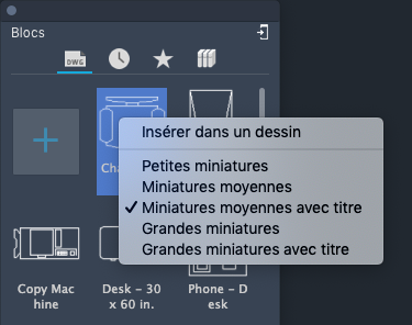 Blocs insérés ou créés récemment. La liste des blocs récents est conservée d'un dessin et d'une session à l'autre.