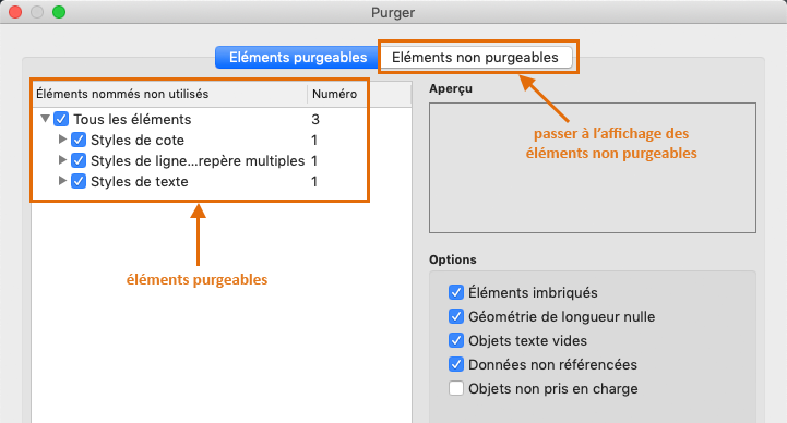 La boîte de dialogue PURGER affiche les objets qui ne peuvent pas être purgés. Vous pouvez basculer entre l'affichage de la liste des éléments purgeables et des éléments non purgeables.