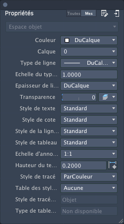 Affiche les propriétés pour le dessin courant ou les objets sélectionnés.