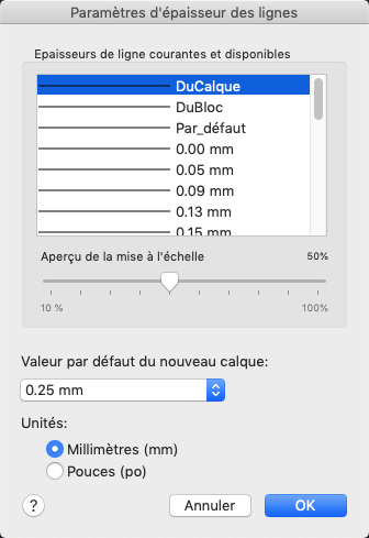 Définit l'épaisseur de ligne courante et les unités d'épaisseur de ligne, gère l'affichage et l'échelle d'affichage des épaisseurs de ligne et indique l'épaisseur de ligne par défaut des calques.