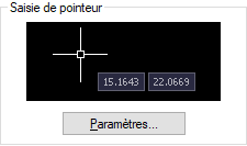 Lorsque la saisie du pointeur (curseur) est activée et qu'une commande est en cours d'exécution, l'emplacement des réticules s'affiche dans les zones de saisie (dans une info-bulle) à proximité du curseur. Vous pouvez entrer des coordonnées dans l'info-bulle plutôt que sur la ligne de commande.