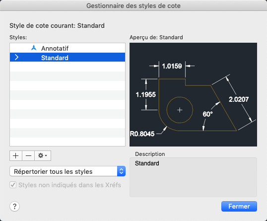 Enumère tous les styles de cote présents dans le dessin. Le style courant est en surbrillance. Cliquez avec le bouton droit de la souris dans la liste afin d'afficher un menu contextuel d'options permettant de définir le style courant, de renommer et de supprimer des styles. Vous ne pouvez pas supprimer un style courant ou en cours d'utilisation dans le dessin. L 'icône précédant un nom de style indique que le style est annotatif.