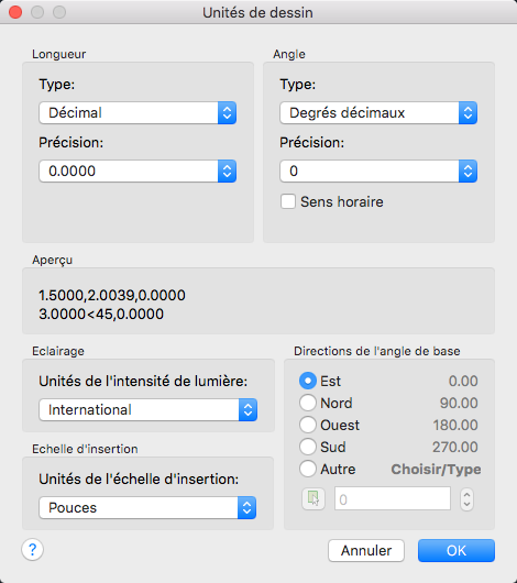 Définit le format courant des unités de mesure. Les valeurs possibles sont Architecture, Décimal, Ingénierie, Fractionnaire et Scientifique. Les formats Ingénierie et Architecture génèrent des affichages en pieds et en pouces et supposent que chaque unité de dessin représente un pouce. Les autres formats peuvent représenter une unité réelle quelconque.