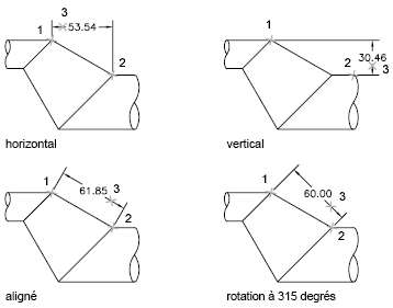 Dans les quatre figures ci-dessus, les points de départ des lignes d'attache (1 et 2) ont été désignés de façon explicite. L'emplacement de la ligne de cote est désigné par le chiffre 3.