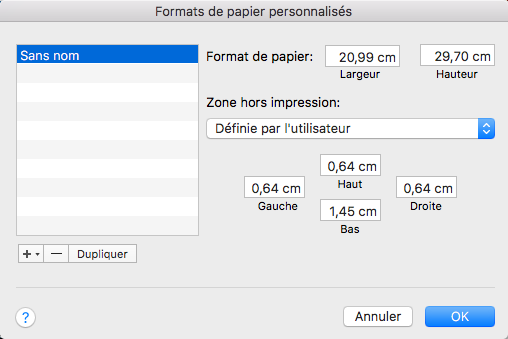 - Dupliquer Copie le format de papier sélectionné pour créer une format de papier personnalisé que vous pouvez ensuite modifier.