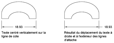 - Si le texte est positionné sur la ligne de cote, l'option Etirer éloigne ou rapproche la ligne de cote de l'objet en cours de cotation. Utilisez les invites de la ligne de commande afin de spécifier un point de base différent ou copier la ligne de cote.