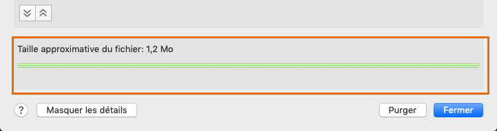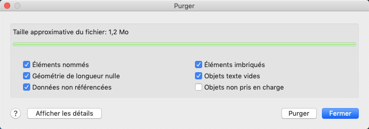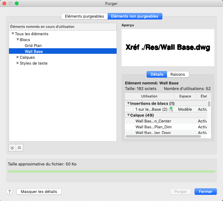 Lorsque vous sélectionnez des éléments et que vous cliquez sur Purger, le volume dont votre fichier de dessin a été réduit et le volume que vous pouvez encore purger sont affichés.
