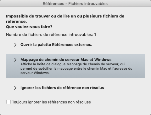 Lorsque les dessins principaux sont sur un ordinateur local et les références sur des serveurs, vous devez résoudre les références à l'aide de la boîte de dialogue Mappage de chemin de serveur.