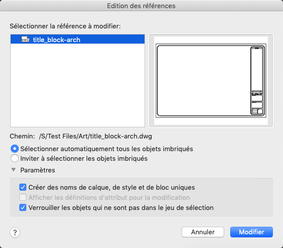 L’aperçu affiche la référence telle qu’elle était lors de son dernier enregistrement dans le dessin. Il n’est pas mis à jour lorsque les modifications sont enregistrées.