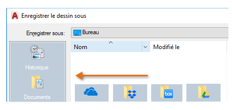 En fonction de ce que vous avez installé, la liste Emplacements des boîtes de dialogue de sélection de fichiers AutoCAD LT peut inclure Box, Dropbox et d'autres services similaires.