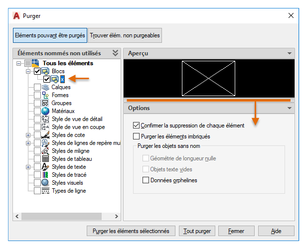 La fonction Purger a été révisée pour faciliter le nettoyage et l'organisation des dessins. Les options de contrôle sont presque identiques, mais l'orientation est plus efficace et la zone d'aperçu est désormais redimensionnable.