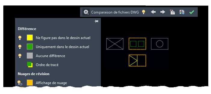 Pour simplifier la modification directe lors du processus de comparaison, les options et commandes de cette fonctionnalité ont été déplacées du ruban vers une barre d'outils ancrée dans la partie supérieure de la zone de dessin. La plupart des options ont été regroupées dans le contrôle Paramètres et améliorées comme indiqué. Vous pouvez facilement activer ou désactiver la comparaison dans la barre d'outils, ainsi que l'affichage des types de différences dans le contrôle Paramètres.