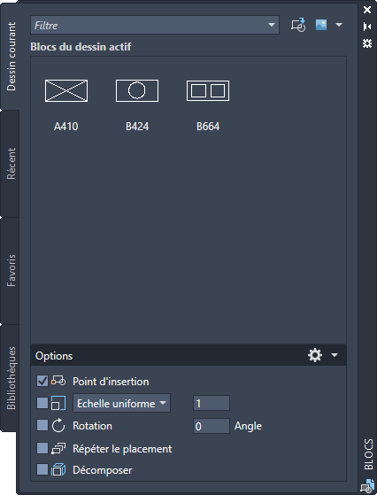 Ces deux options ouvrent la palette Blocs soit dans l'onglet Récent, soit dans l'onglet Autre dessin. L'onglet Dessin courant de la palette des blocs affiche les mêmes blocs dans le dessin courant et la galerie du ruban. Vous pouvez placer des blocs à partir de la palette des blocs en effectuant un glisser-déposer ou en cliquant sur le bloc pour le placer.