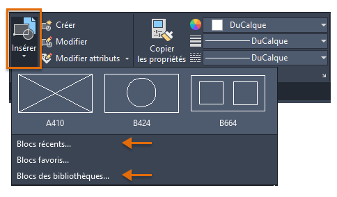 Lorsque vous cliquez sur Insérer dans le ruban, une galerie de blocs disponibles dans le dessin courant s'affiche avec deux nouvelles options : Blocs récents et Blocs issus d'autres dessins.