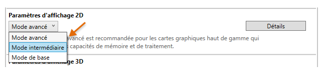 AutoCAD LT se lance désormais correctement sur plusieurs pilotes DirectX (Dx9, Dx11 ou aucun pilote), écrans haute résolution (4K) et moniteurs doubles. En outre, les paramètres d'affichage des graphiques sont regroupés en trois modes, qui incluent des hachures dégradées et des images. Le paramètre des performances graphiques, Mode intermédiaire, est mis à jour pour rétablir automatiquement plusieurs paramètres d'affichage afin d'optimiser votre affichage.