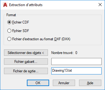 Spécifie le format de fichier des informations d'attribut, les objets à partir desquels vous voulez extraire des informations, ainsi que les noms du gabarit et du fichier de sortie.