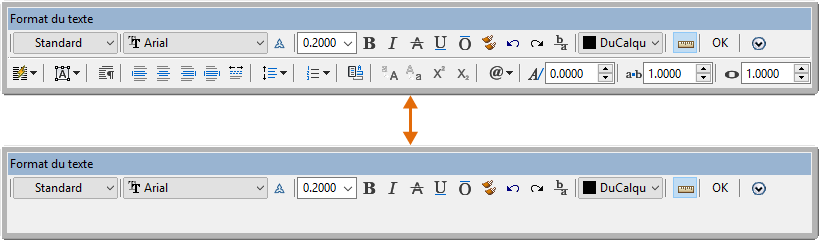 Gère l'affichage de la barre d'outils Format du texte. Cette option définit la variable système MTEXTTOOLBAR. (Indisponible pour le texte sur une seule ligne.)